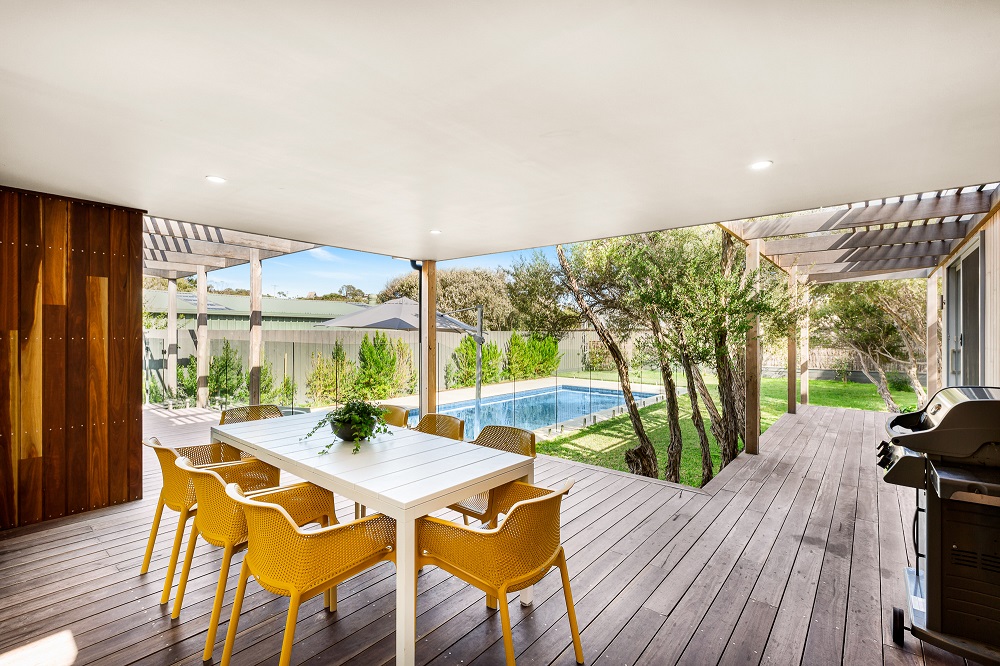 DESCRIPTIONTi Tree Grove is the ideal in luxury, modern holiday living. It is a brand new house and everything in the home is brand new, from the quality appliances to the modern furnishings and comfortable furniture. Situated in a quiet pocket of Blairgowrie, the ocean beach is just a walk away, and it is only a few minutes drive to the Blairgowrie village shops and bay beach. Ti Tree Grove has 4 bedrooms and 2 bathrooms, one with a bath, plus a powder room. Featuring a 9m x 4m solar heated swimming pool, where many summer days can be spent lazing and enjoying the peace. Winter is well covered too by the spectacular feature ceiling-suspended fireplace. The home has ducted heating and cooling throughout so it is perfect for any temperature. The luxury finishes include a great kitchen with marble benchtops, a butler's pantry, two Bosch ovens, Nespresso coffee machine and Asko dishwasher. The outdoor area has a BBQ on mains gas. The laundry has Miele washing machine and clothes dryer. There is WiFi, and the TV in the main living room has Foxtel and is situated around the beautiful open fire and has a reading nook that enjoys that space too. There is also a table tennis room. BEDROOM CONFIGURATION - 4 BEDROOMS - SLEEPS 8 PEOPLE Master bedroom - king sized bed, ensuite, WIR. 2nd bedroom - queen sized bed, BIR, TV/DVD (this is a good spot for children to watch their movies) 3rd bedroom - queen sized bed , BIR 4th bedroom - a set of king single bunks, WIR and adjacent to the powder room. Please note that we only rent to mature groups or families. No schoolies allowed. This property is not pet friendly. Bed linen and bath towels are included for every booking. Please note the solar heater in the pool is turned on during the months of November to April and requires the sun to be effective.