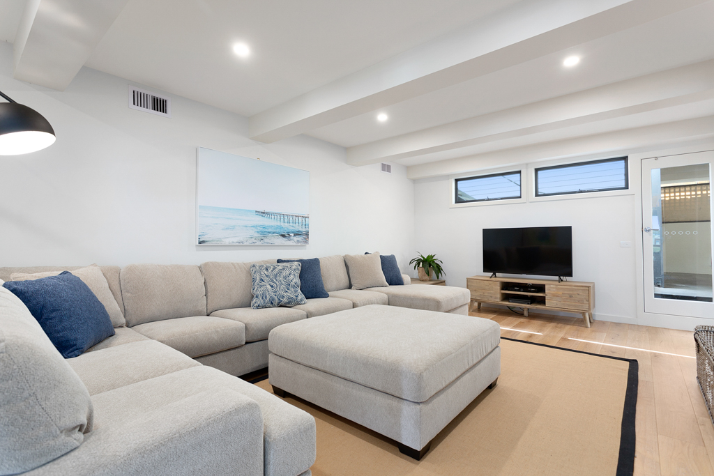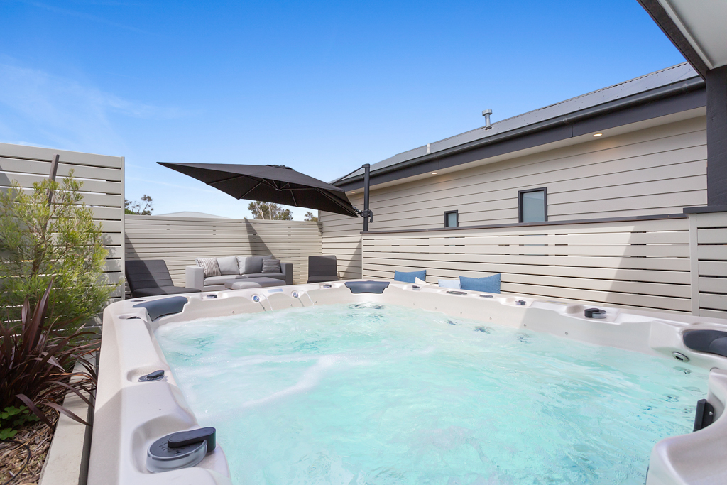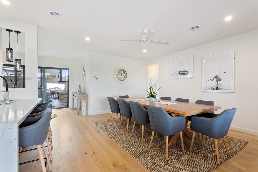 This fantastic spacious family home has 5 bedrooms (3 upstairs and 2 downstairs), 3 bathrooms (one with a bath), and multi zones with 2 living rooms (2 large TVs with Foxtel, one with a PlayStation2), a reading area and fantastic outdoor spaces. There is an open planned kitchen (coffee machine and dishwasher) and dining area with a 10 seater dining table and this area opens out onto the front deck which has an outdoor table and views over the treed canopy to the bay. The rear has a BBQ and large spa which is fantastic for relaxing and unwinding after you have had a game of table tennis. With all this space it comfortably accommodates 2-3 families.