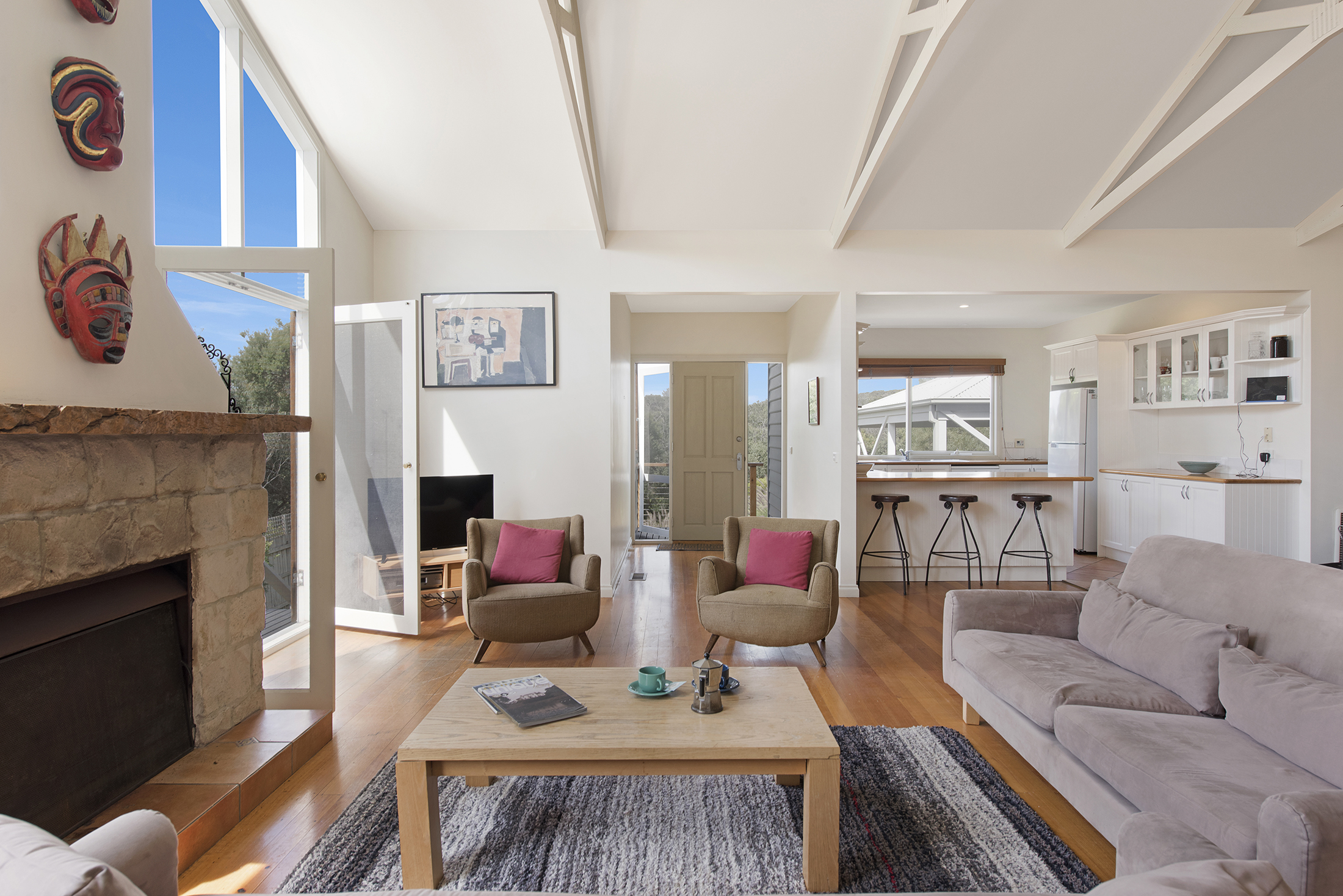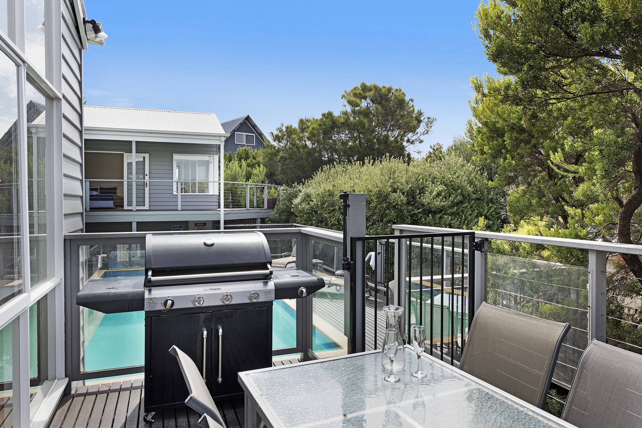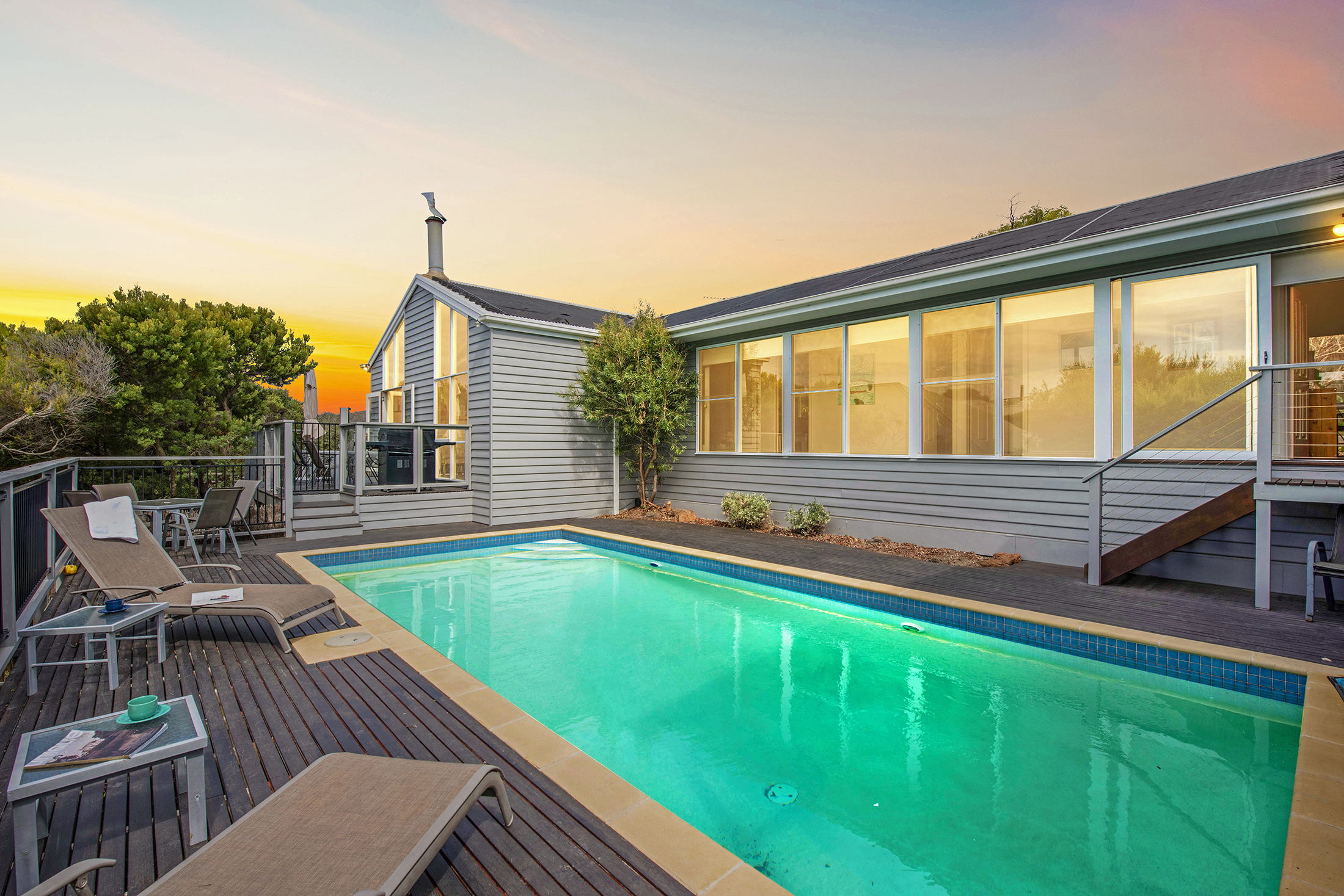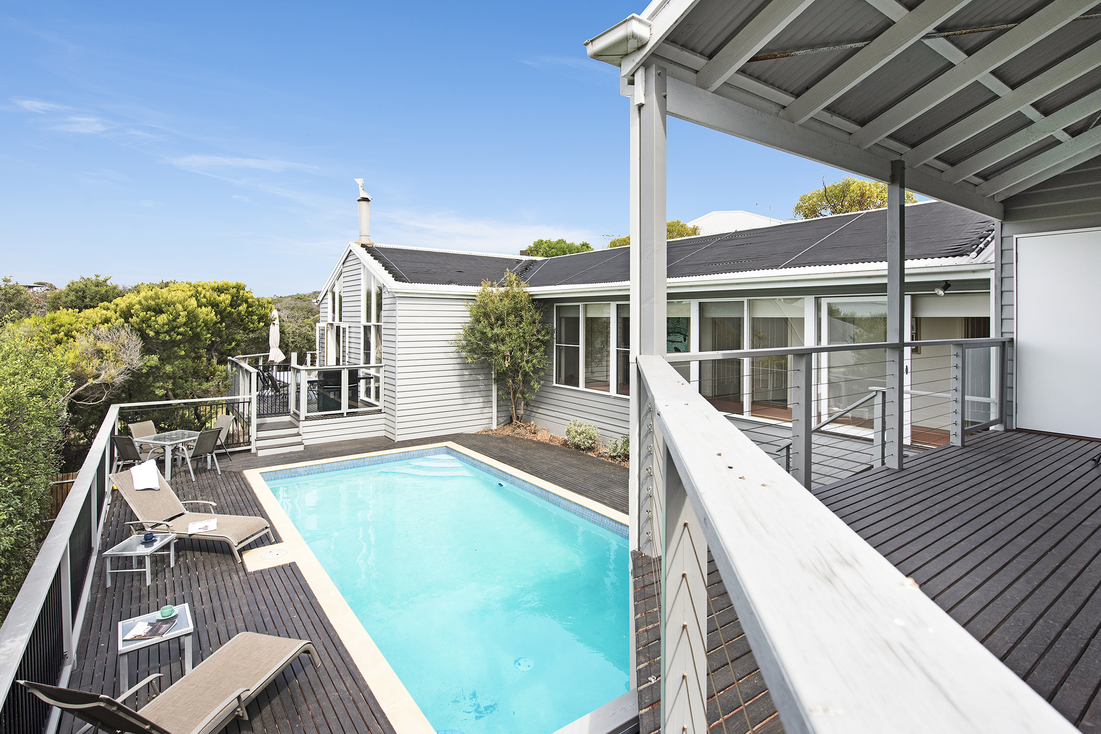 DESCRIPTIONLocated only minutes from the ocean side of the Peninsula, this stunning property is a short walk through the National Park to the spectacular "Centrals" Surf beach. In fact, "Four Seasons" is literally one door in from the entrance to this beach. There is a beautiful swimming pool which is mineral rich and salt-chlorinated with solar heating (*you can elect to have the pool gas heated to 32 degrees for an additional $200 for a weekend getaway or stays up to a week, on request) and is surrounded by a huge outdoor decking area complete with sun lounges to relax and make the most of the magnificent Mornington Peninsula lifestyle. As soon as you enter the front door, you will be welcomed by light and a spacious open plan living/dining area and kitchen with all the essentials you require to escape the outside world and relax. There is an air conditioner in the main living room, ducted heating throughout and it even has a fire place for cozy winter holidays. With a choice of 4 bedrooms, there is plenty of room to spread out. The main bedroom is located at the rear of the property and features its own sitting area, TV, and deluxe ensuite bathroom complete with spa bath and private balcony overlooking the pool. Or head down towards the front of the house where the pool greets you from every window, with a choice of three bedrooms, each sharing the main bathroom with separate toilet. All of this and only minutes to the Sorrento Shopping strip and surrounded by National Parks, golfing, the hot springs, and beaches on either side. Come and enjoy all the Peninsula has to offer! There's even free WiFi. BEDROOM CONFIGURATION - 4 BEDROOMS - SLEEPS 9 PEOPLE We only rent to families or mature groups. No schoolies allowed. The property is fully fenced and private. As a bonus, all bed linen and bath towels are included for your booking. * Please let us know when booking if you would like to pay the extra $200 to have the pool gas heated.