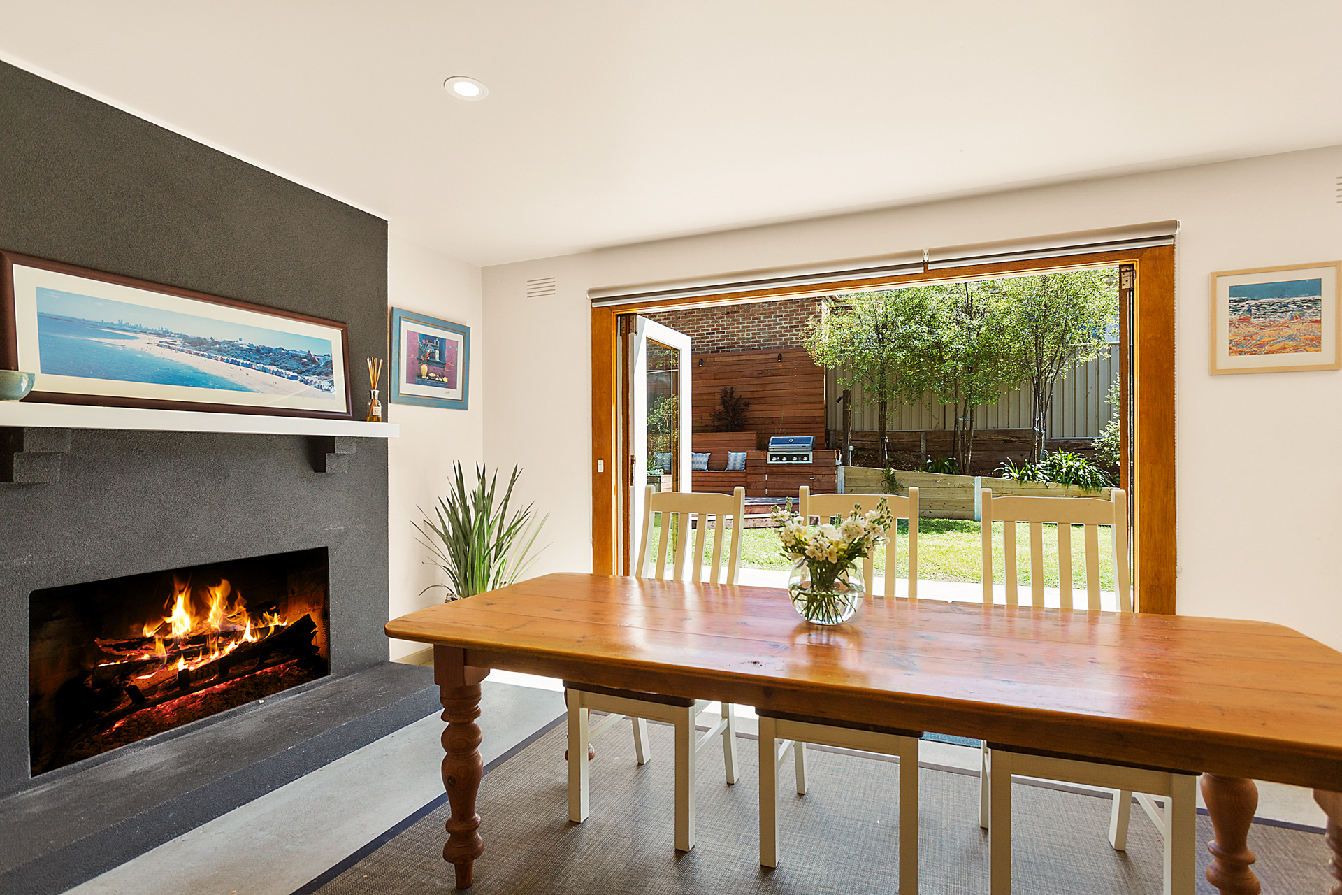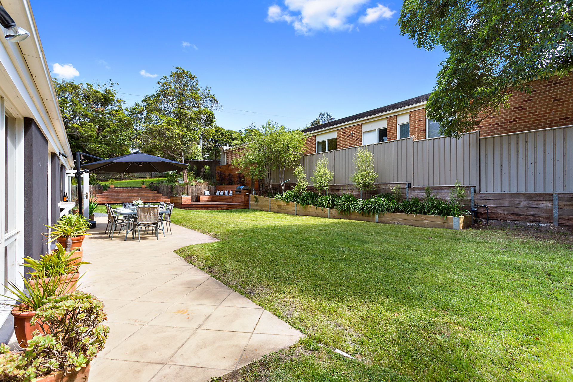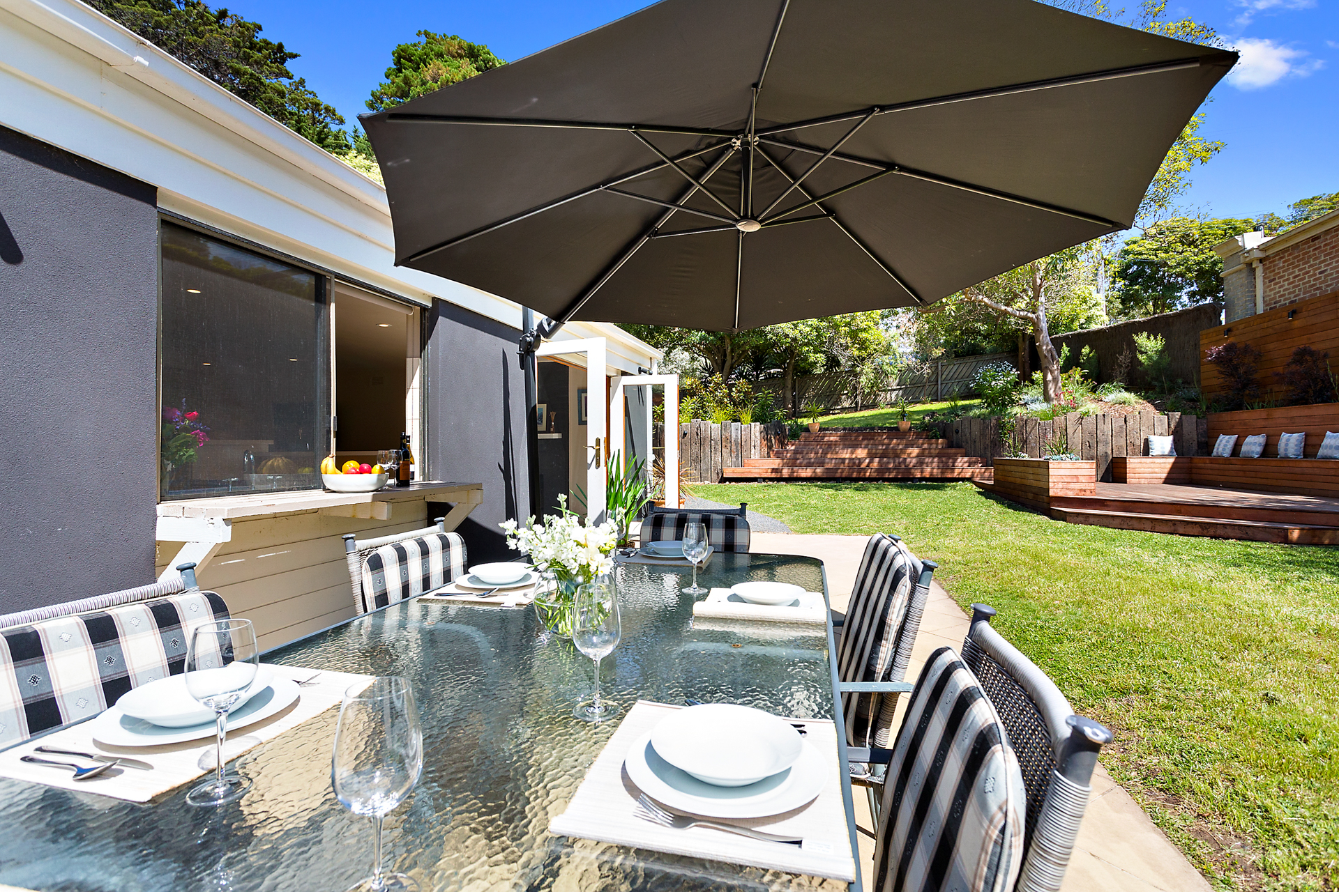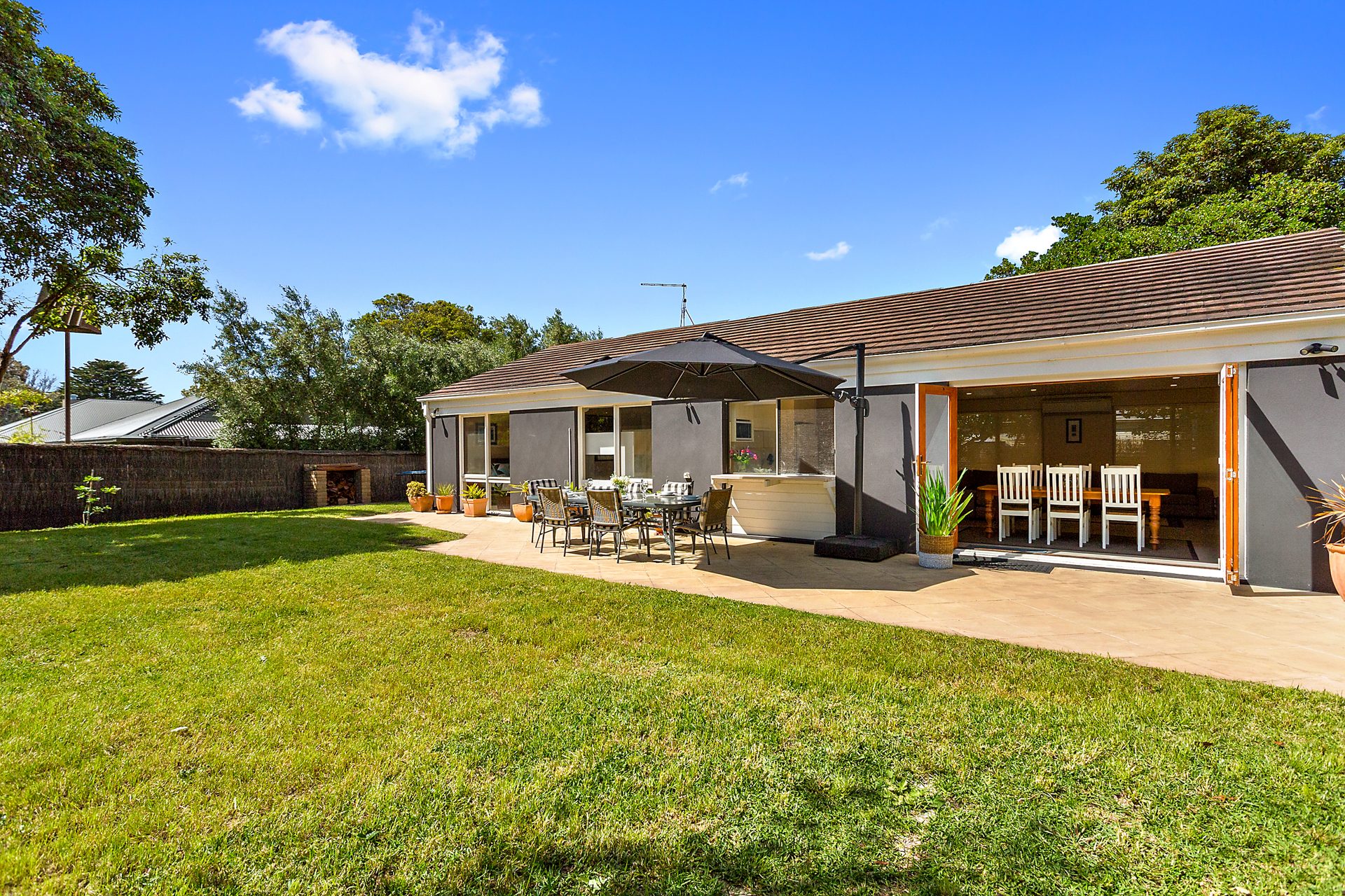 The fully fenced large rear garden makes it perfect for al fresco dining or watching the children play in secure and private surrounds. The outdoor dining table is protected by a large shade sail.
