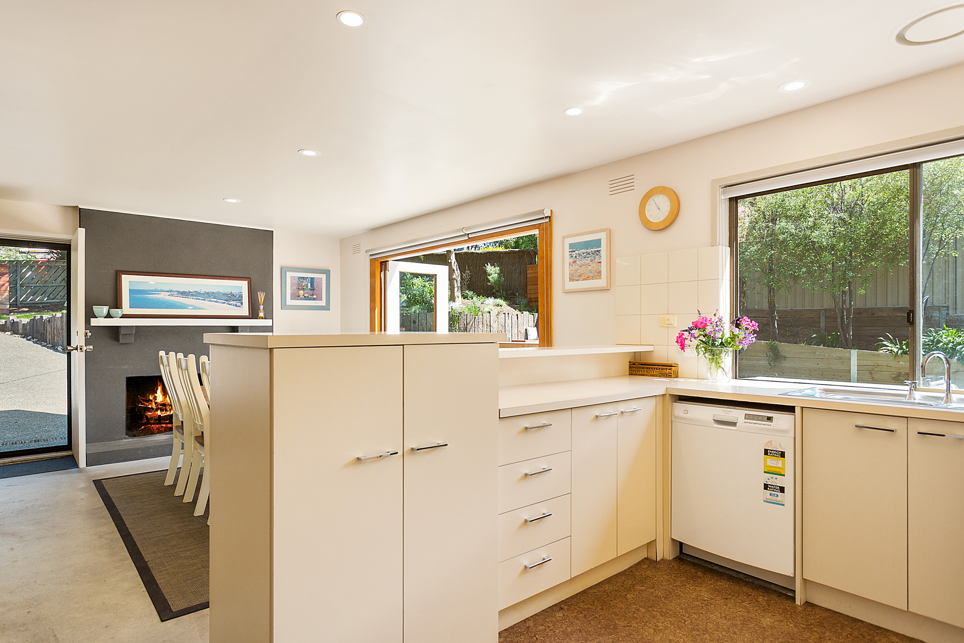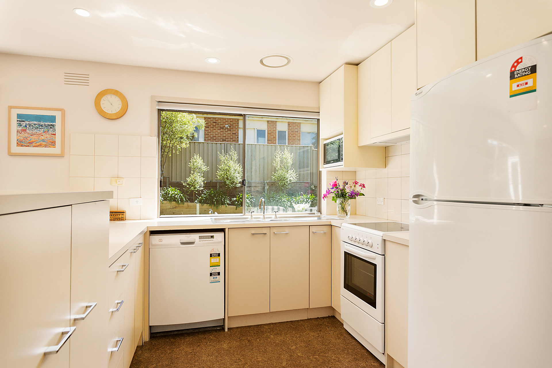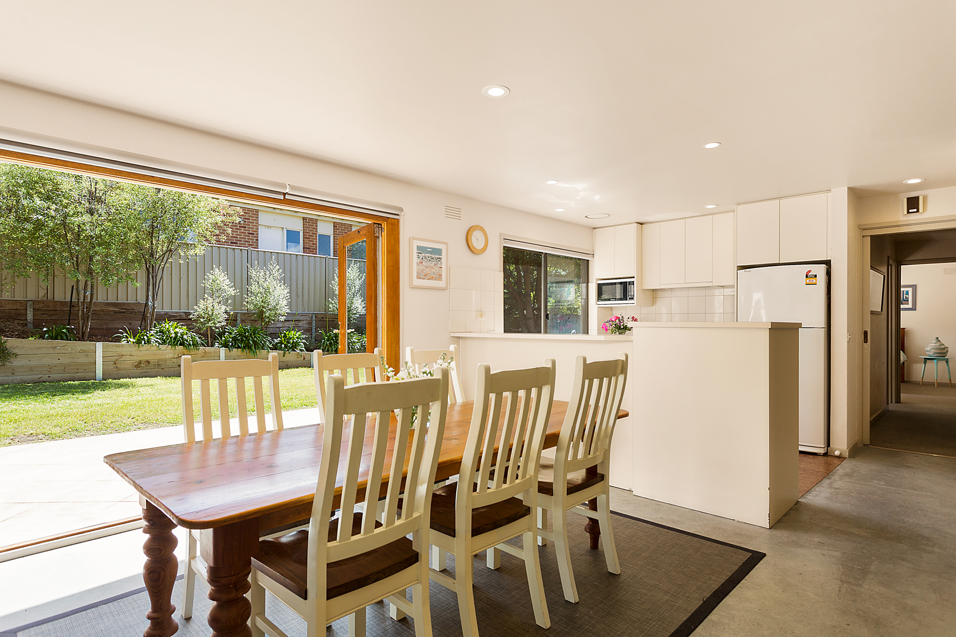 The large living area has a wall mounted plasma TV, open plan kitchen (with microwave, coffee machine and dishwasher) and dining area opening to the courtyard and backyard. There are 2 bathrooms (one with a bath) which makes it suitable for either a 1 or 2 family stay. There is a Smart TV in one of the bedrooms.